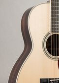 Our 3-style (003) features East Indian rosewood back and sides with ivoroid body/fingerboard/peghead binding and butt wedge, no herringbone top purfling, a “chevron” backstrip, no fingerboard inlays, and an abalone rosette.