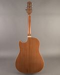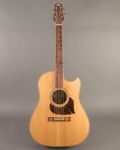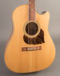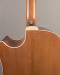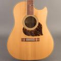 This Randy Wood is an awesome slope‑shoulder dread build. Featuring a cutaway, it has a strong midrange and airy low end for its size, without feeling like any of that is sacrificed by the cutaway. This is likely due to the twelve fret construction making up for the loss in body size. The neck has a very comfortable C shape, and it looks gorgeous and unique with its pickguard swinging behind the soundhole. Comes in a HSC.